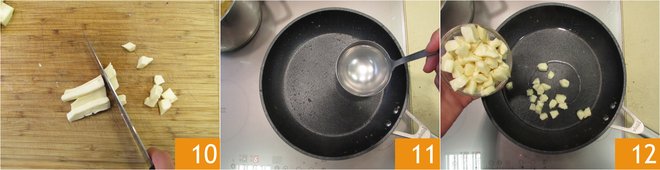 Dice the taleggio cheese 10. Reuse the saucepan to prepare the sauce. Add a ladle of pasta cooking water 11 and the taleggio cheese 12.
