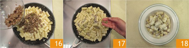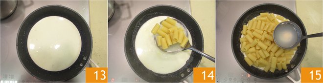 Cook on a low flame 13 to melt the cheese. Drain the pasta and add it straight to the pan with the taleggio cheese 14, stir, then add a ladle of cooking water 15.