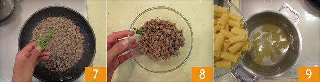 Remove from the heat once cooked, saut? and add the fresh rosemary 8. Place the sausage in a bowl 8. In the meantime, cook the pasta in boiling salted water 9.