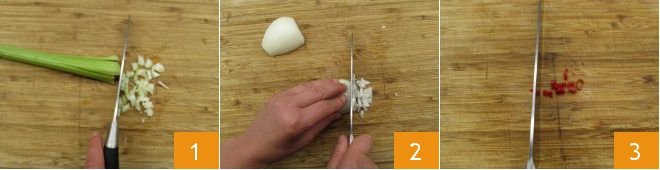To make the pasta with smoked pancetta sauce, start by cleaning and chopping the ingredients to be cooked: Finely chop the celery 1 and the onion 2. Then chop the chili as well 3, removing the seeds to take away some of the heat.