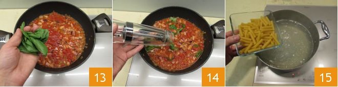 Shred the basil by hand 13, add to the pot, and season with salt and pepper 14. Cook the sauce for around 20 minutes or until it is dry enough or has reached the desired consistency. In the meantime, cook the sedanini rigati in salted boiling water 15.