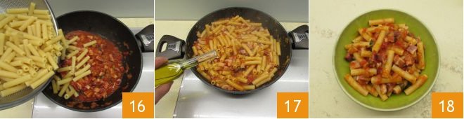 As soon as the pasta is al dente, drain and pour it into the sauce 16. Now, just add a pinch of pepper, a drop of oil 17, and a few basil leaves to your plates of pasta with smoked pancetta sauce. Buon appetito 18!