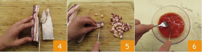 Remove the rind on the smoked pancetta 4 and chop the pancetta into tiny pieces 5. Finally, finely chop the peeled tomatoes 6 and then head over to the stove. Put a pot full of water on to boil to cook the pasta.