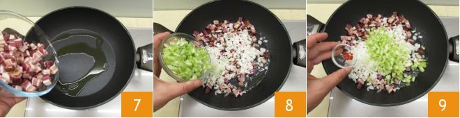 Heat a glug of oil in another pot, then brown the pancetta 7 with the onion, celery 8, and chili 9, over low heat.