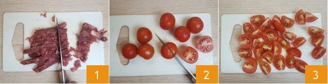 To make this pasta with stracchino, bresaola, and cherry tomatoes, first bring a pan of water to a boil before adding salt. Slice the bresaola 1 into strips and then into smaller pieces. Wash the cherry tomatoes and cut them into quarters to form wedges (2-3).
