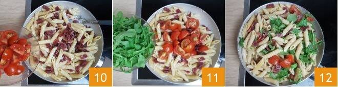 the cherry tomatoes 10, and finally the washed and dried arugula 11. Stir one last time and serve your pasta with stracchino, bresaola, and cherry tomatoes 12 immediately.
