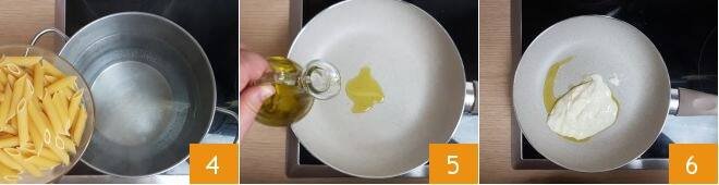 Once the water is boiling, pour in the pasta 4 and cook for the time stated on the package. While the pasta is cooking, turn your attention to the sauce. Pour a little oil 5 and the stracchino cheese into a pan 6.