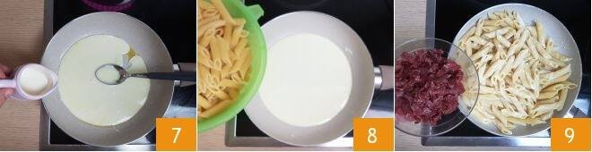 Heat up over low heat, and then add the milk for a looser consistency 7. Stir to combine and, once the pasta is ready, drain and pour directly into the pan 8. Sauté the pasta to develop the flavor, then turn off the heat and add the bresaola 9,
