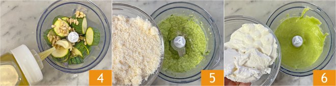 Pour in the olive oil 4 and blend to combine everything, then add the grated Parmigiano Reggiano DOP 5 and blend again. Finally, add the ricotta 6.