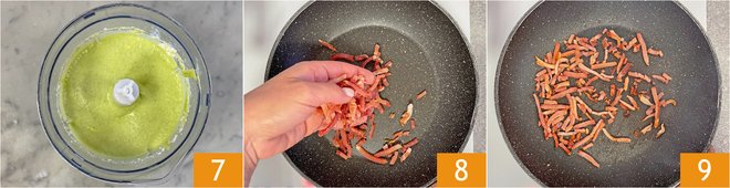 Blend until you get a smooth and homogeneous cream 7. Cut the speck into strips and brown it in a non-stick pan for about 5 minutes, without adding any fats 8; it should be crispy and golden 9.
