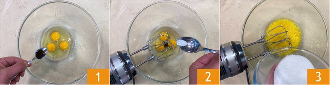 To make the peach upside-down cake, first prepare the batter: melt the butter in a small saucepan and let it cool. In a large bowl, pour the eggs, vanilla extract 1, and salt 2. Start beating with an electric mixer, then add the sugar 3. Continue working until you get a frothy mixture.
