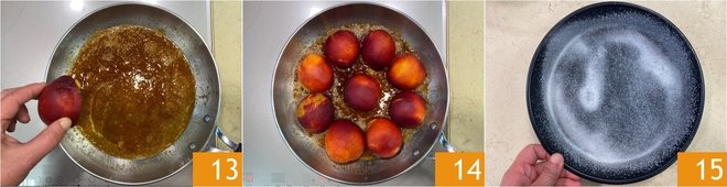 Place the peaches in the pan so that the cut side is in contact with the caramel 13 and leave them like this for a minute, then turn off the heat 14. Meanwhile, butter and sprinkle with sugar a cake pan with a diameter of 8 1/2 inches at the base and 9 1/2 inches at the top 15.