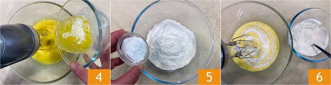Now, gradually pour in the cooled melted butter while keeping the mixer running 4. In a separate bowl, mix the flour and baking powder 5, then gradually add the dry ingredients to the mixture 6.