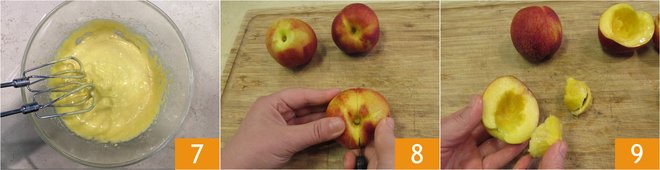 Continue working until you get a smooth and homogeneous batter 7. Set aside and take care of the peaches: wash and halve them 8, then remove the pit 9.