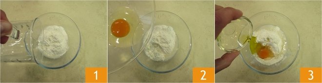 Place the flour, water 1, egg 2 and oil in a bowl 3.
