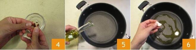 Next, crumble the dried chili 4. Place a pot full of water, salted to taste, on the stove to cook the pasta. Meanwhile, pour a drizzle of oil 5 into a pan and add the peeled garlic clove 6.