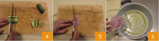 Cut the sticks in half 4 to get sticks about 3/4 to 1 1/4 inches long. Finely chop the shallot 5 and put it in a pan together with 2 teaspons of oil 6.