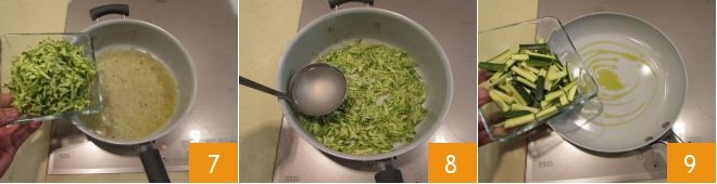Let it soften by adding a ladle of hot water and add the grated zucchinis 8, salt, pepper, add another ladle of hot water 9 and cook for about ten minutes, until they soften. Meanwhile, pour the remaining 2 teaspons of oil into a pan and add the zucchini sticks 9.