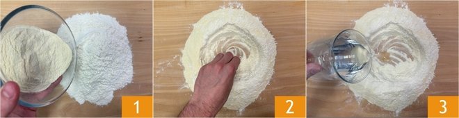 To prepare pici with breadcrumbs, first make the fresh pasta dough: pour the flour and semolina on the work surface 1 and create the classic fountain shape 2, then gradually add warm water 3.