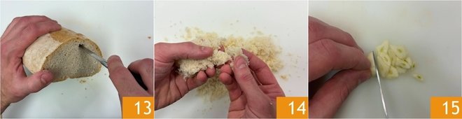 Now prepare the sauce: take the crumb from a loaf of stale bread 13 and break it into small pieces with your fingers 14. Slice the garlic cloves 15 and chop the fresh chili pepper into rings.