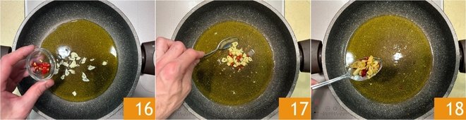 Heat the oil in a pan, add the garlic and chili pepper 16 and let it flavor for a few minutes 17. When the garlic is golden, remove it from the pan along with the chili pepper 18.