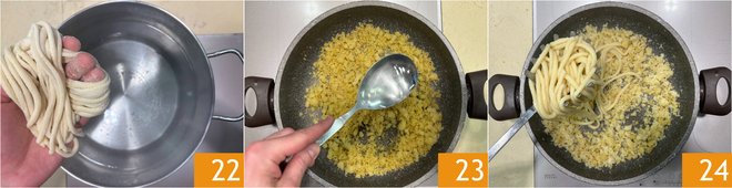 In the meantime, bring a pot of salted water to a boil and cook the pici for 6-8 minutes 22. Moisten the crumbs with a ladle of the pasta cooking water 23, then drain the pici directly into the pan 24.