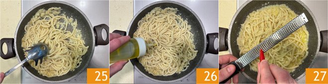Return the pan to the heat and toss everything until the liquid is absorbed 25. Finally, mix in a drizzle of oil 26 and grate some fresh chili pepper to taste 27.