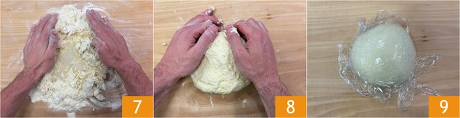 Continue adding water and kneading with your hands 7 until you get a smooth and elastic dough 8. Wrap it in plastic wrap and let it rest at room temperature for 30 minutes 9.