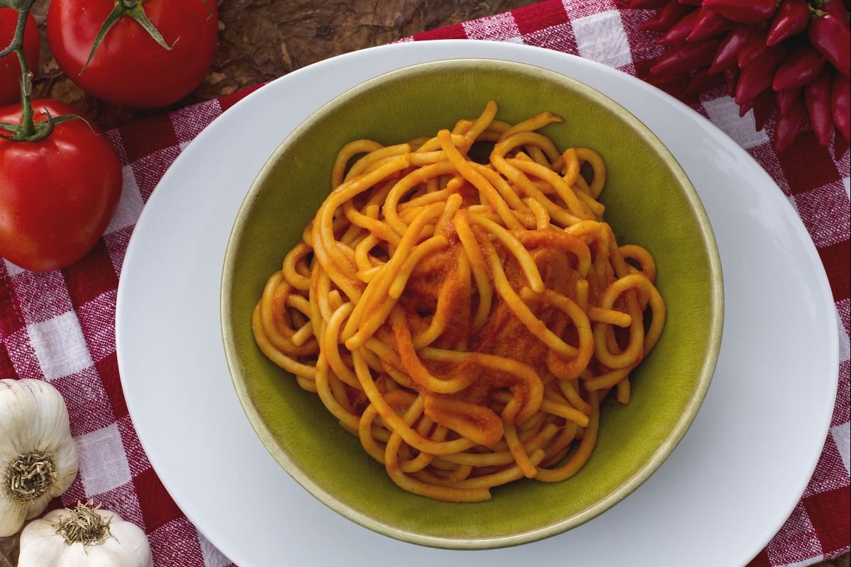 Pici with garlic is a traditional pasta dish from Tuscany, particularly from Val di Chiana. This region is the cradle of one of the products belonging to the Slow Food presidium: Chiana garlic. A variety of garlic rediscovered relatively recently, with significant dimensions and a less pronounced, more delicate flavor compared to other types of garlic. The pasta format, pici, is made with a dough of flour and water, very common throughout central Italy. They are also found dressed with ragù, duck, or breadcrumbs, but they are also excellent with cherry tomatoes and ricotta or with a vegetarian mushroom and walnut ragù.