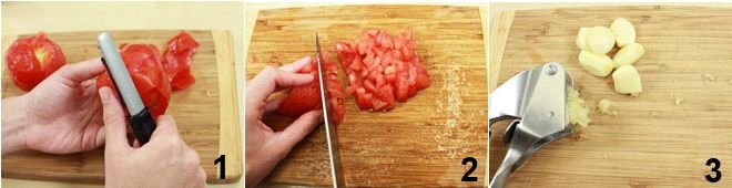 To prepare pici with garlic, start by blanching the tomatoes in boiling water for 1 minute. Peel them and remove the seeds, then cut them into small cubes (1-2). Crush the garlic well 3. If you don't have this tool, you can slice the garlic and then crush it with the flat side of a thick knife.