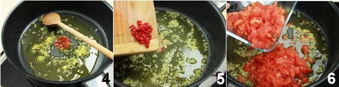Place the crushed garlic in a pan with the oil and the chili pepper, seeded and finely chopped (4-5). Sauté over very low heat: the soffritto should cook slowly, and the garlic should not turn brown but just dissolve. Leave it on the heat for about ten minutes until the garlic starts to dissolve. At this point, add the chopped tomatoes 6.