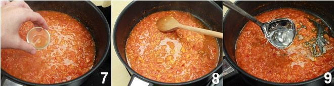 Add the vinegar 7 and adjust the salt. Cook the sauce over low heat until the tomatoes have broken down 8, resulting in a creamy sauce (this will take at least 20 minutes). Meanwhile, bring salted water to a boil for the pasta. If the sauce becomes too dry, you can add 2/3 ladles of pasta cooking water 9.