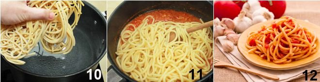 When the water boils, add the pici 10 and, after the cooking time, which generally takes about 18 minutes, drain them al dente and toss them in the sauce to flavor them (11-12). Serve the pici with garlic piping hot!