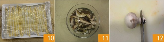 Lay the pici on a tray lined with a cloth sprinkled with semolina and cover with plastic wrap 10. Move on to the mushrooms: soak the dried porcini to rehydrate them 11, then clean the fresh mushrooms by removing the earthy part of the base 12.