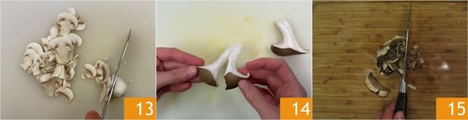 Slice the portobello and champignon mushrooms into thin slices 13, tear the oyster mushrooms by hand 14, and leave the brown beech mushrooms whole. Drain the porcini mushrooms and chop them finely with a knife 15.