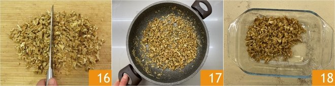 Now, prepare the walnuts: roughly chop the kernels 16 and toast them for a few minutes in a pan with a drizzle of oil, so they release their natural oils 17. When you start to smell them, turn off the heat and transfer the toasted walnuts to a bowl. Set aside 18.