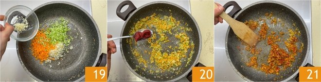 In the same pan, add oil and the previously chopped vegetables for the soffritto, namely onion, carrot, celery, and garlic 19. Sauté the soffritto over low heat, then add the tomato paste 20 and mix well to blend 21.