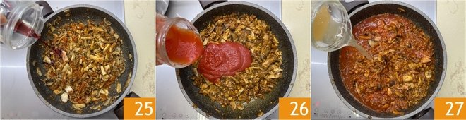 Deglaze with red wine 25 and let the alcohol completely evaporate, then add the toasted walnuts and the tomato purée 26, rinsing the jug with a little water. Also pour in the hot vegetable broth 27.