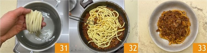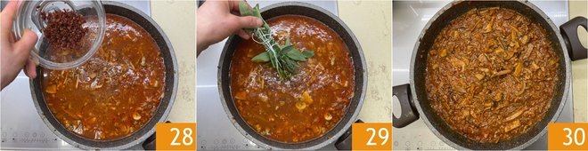 Finally, add the chopped sun-dried tomatoes 28 and a bouquet of fresh aromatic herbs tied together with string 29. Let it simmer gently for 2 hours. When the ragù is ready 30, bring a pot of salted water to a boil for the pici.