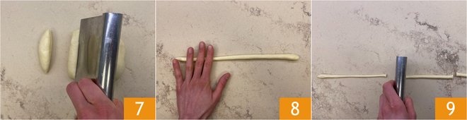 After the dough's rest time, divide it into smaller portions 7 and form long, thin ropes 8. Cut the ropes to obtain pici about the length of spaghetti 9.