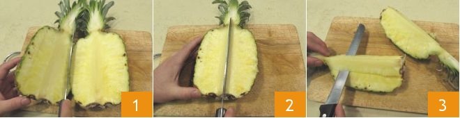 To prepare the piña colada, first cut the pineapple in half 1 and then lengthwise to get the quarter you need 2 (you can use the rest of the pineapple for other fresh preparations like Huli Huli Chicken, Fish Tacos with Pineapple Salsa, ham and pineapple, pineapple and salmon skewers with lemon or shrimp salad in a pineapple). Then make a cut to detach the woody core from the pineapple quarter 3.
