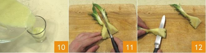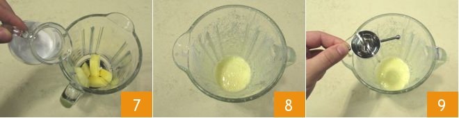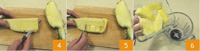 With a sharp knife separate the pineapple pulp from the skin 4, then cut the pulp into thick slices 5. Transfer the pineapple pulp into the blender cup 6,