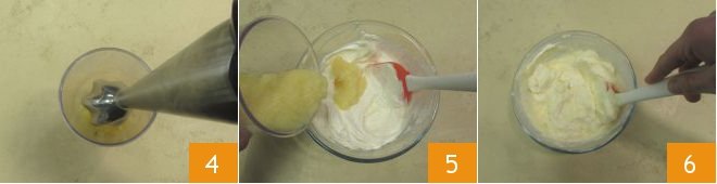 Blend 1/3 of the diced pineapple with an immersion blender 4 until you get a puree. Combine the puree with the mascarpone cheese 5 and mix to combine with a spatula 6.
