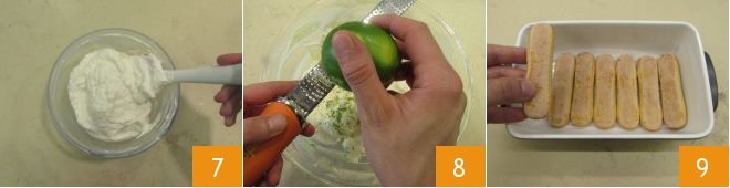 Once ready 7, grate the lime 8. Arrange the ladyfingers in a 9''x 6'' baking dish 9,