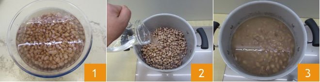 To prepare pisarei e fasò, start with the borlotti beans. Place them in a large bowl filled with water and soak them for 12 hours or overnight, covered with plastic wrap 1. After the soaking time, drain and rinse them under running water, then place them in a pot, cover with water 2, and cook for 30 minutes 3; this time will be sufficient because the beans will continue cooking with the sauce later.