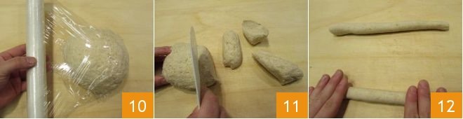 and wrap it in plastic wrap 10. Let the dough rest in a cool place for 1 hour (outside the fridge is fine). After the resting time, take the dough, divide it into small portions 11, and from these create ropes approximately 3/8 inch in diameter 12.