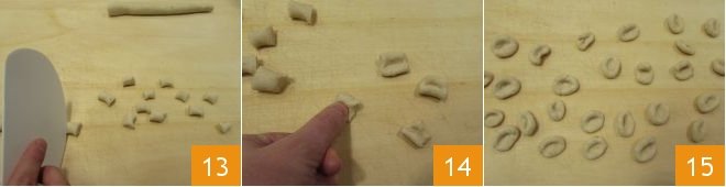 Cut the dough ropes into pieces the size of a bean 13. With your thumb, press each dumpling to create a hollow inside 14. The pisarei are ready 15; you can spread them on a tray lined with a clean, dry kitchen towel, lightly floured. There is no need to cover them, even if they dry out it will not be a problem.