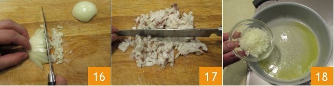 Now prepare the sauce: peel and finely chop the onion 16, also chop the lard 17. Then, in a pot, melt the butter over low heat and sauté the onion 18,