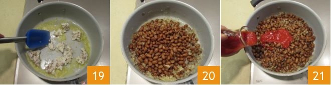 then add the chopped lard 19, stir to flavor, and when the onion has wilted, also add the previously cooked and thoroughly drained beans 20, cover them with tomato puree 21 and continue cooking the sauce for about 20 minutes. You can adjust the salt and add hot water (or vegetable broth) if necessary so the sauce does not thicken too much.