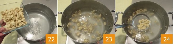 When the beans are cooked, bring a large pot of water to a boil, salt to taste and submerge the pisarei 22 and cook them for just a few minutes or until they float to the surface 23; then scoop them out with a slotted spoon 24